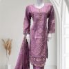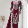 This exquisite ensemble features a long kameez adorned with intricate gold embroidery that radiates sophistication and charm. The heavy embroidery is complemented by delicate stone embellishments, adding a touch of glamour that is sure to turn heads at any occasion. Paired with stylish plazzo pants, this suit offers both comfort and style, making it ideal for festive celebrations or formal gatherings. The chiffon embroidered dupatta drapes gracefully, enhancing the overall look while providing a lightweight feel. Step into the spotlight and make a lasting impression with this luxurious maroon suit that embodies grace and beauty.